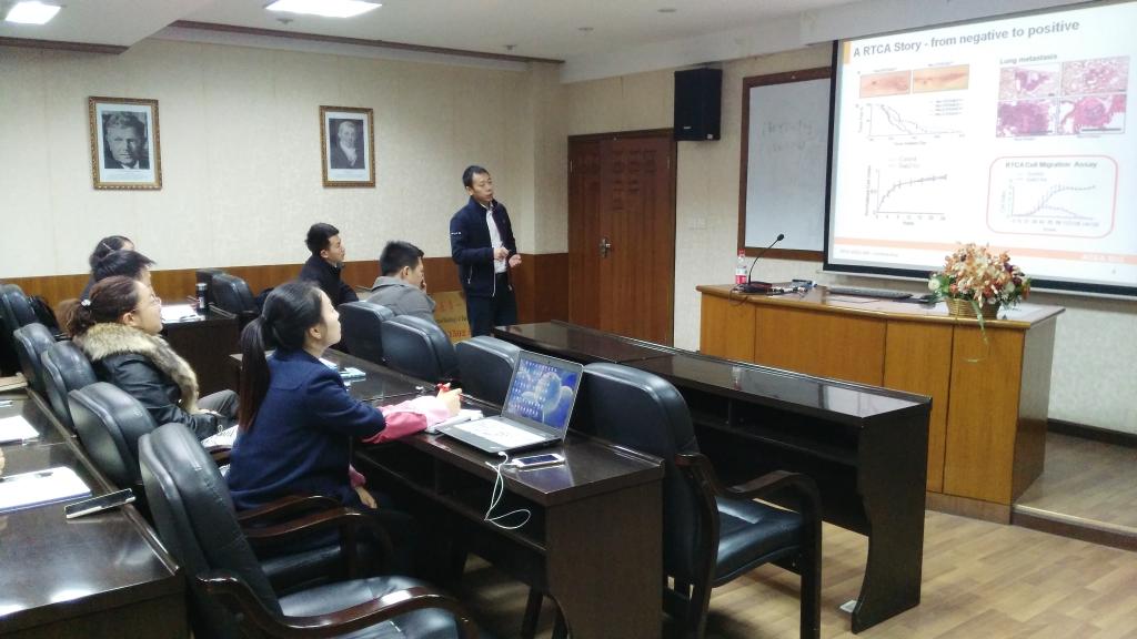2015年11月27日,艾森生物高级产品经理黄茂华在组织工程与干细胞实验中心作题为“实时无标记分析技术(TRCA)在细胞生物学研究中的应用”的学术报告,在报告上一方面给我们介绍了最新的细胞分析技术的原理和使用范围,一方面着重介绍了实时无标记分析技术在细胞增殖、细胞质控、细胞迁移和浸润、细胞共培养、信号通路、肿瘤免疫以及新药筛选方面的优势。