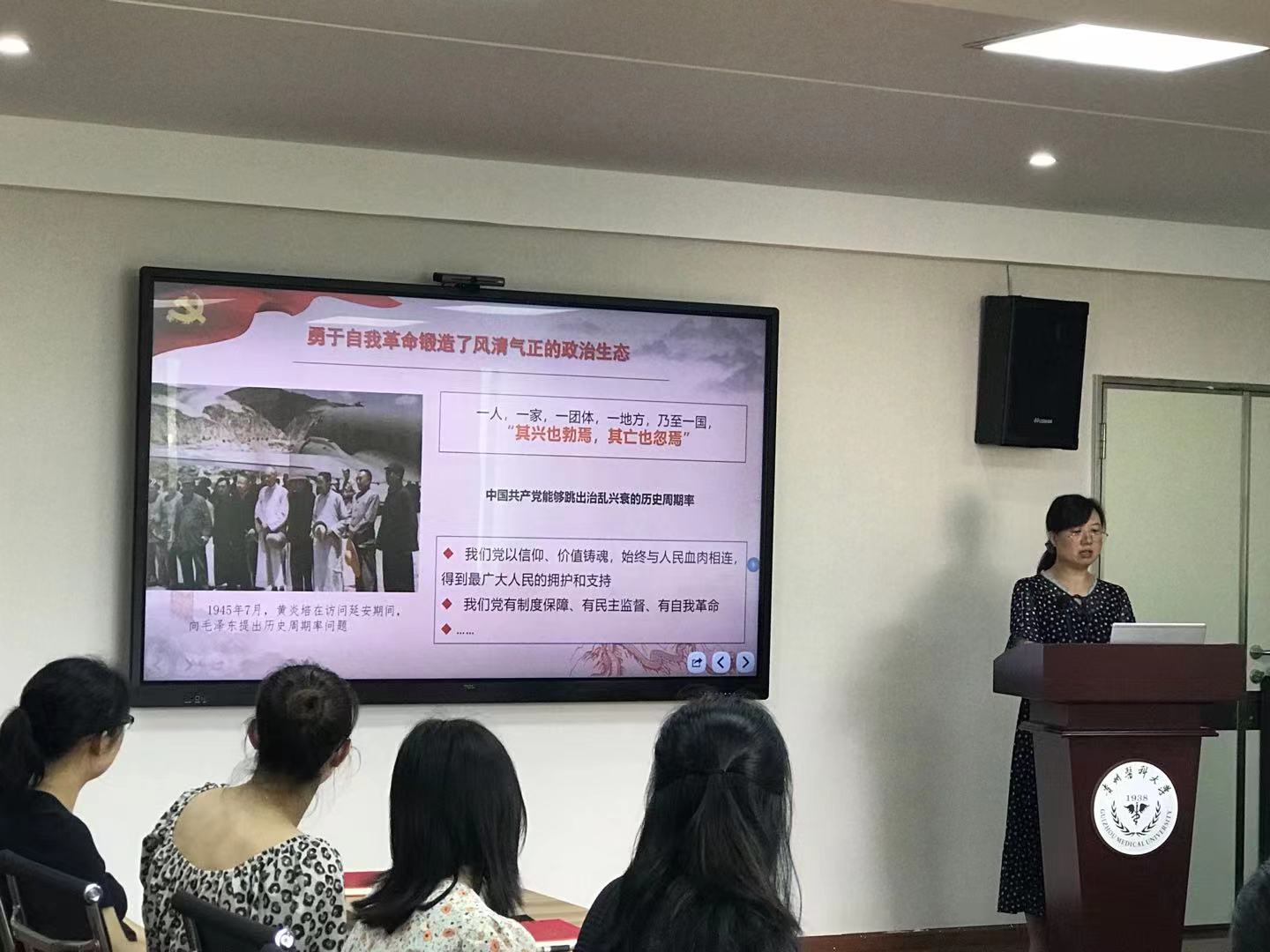 2021年7月21日上午,基础医学院教工第十四党支部书记苏敏同志,为我支部全体党员以“中国共产党是为中国人民谋幸福的政党,也是为人类进步事业而奋斗的政党”为题,上了一堂深刻的党课。党课围绕“科学的理论指导、坚定的理想信念、强大的组织优势、坚实的群众基础和彻底的自我革命”几方面展开,特别围绕党和国家几代领导人对党的群众路线的深刻论述,集中反映了我么党关于群众工作的思想内涵和基本精神,是党的强大政治优势,是党的性质和宗旨的重要体现,也是中国革命胜利最根本的经验和克服前进道路上各种困难的法宝。